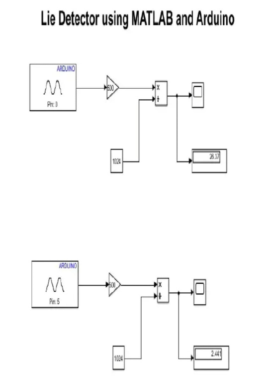 Developed a Lie Detector System integrating Arduino for real-time physiological data acquisition and MATLAB Simulink for signal analysis. The system measures biometric responses such as heart rate variability and skin conductivity, correlating these with stress levels. While not detecting lies directly, it interprets physiological changes associated with deception. This project enhances understanding of biometric sensing technologies for behavioral analysis and stress detection applications, showcasing the integration of hardware and software to create a robust lie detection framework using accessible tools like Arduino and MATLAB Simulink.
